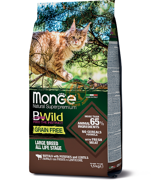 Monge BWild Cat GRAIN FREE беззерновой полноценный сбалансированный корм из мяса буйвола для крупных кошек всех возрастов.