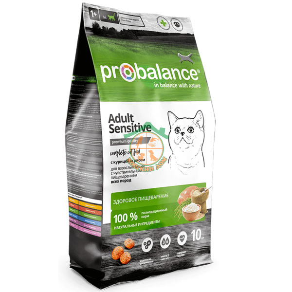 В отличие от обычных кормов, из ингредиентов Probalance "Sensitive" исключены компоненты, обладающие высоким индексом аллергенности. Основа корма – мясо и рис. Рис обволакивает слизистую желудка, оказывает укрепляющее действие, одновременно выводит токсины. Пищевые волокна стимулируют и держат в тонусе моторику кишечника.