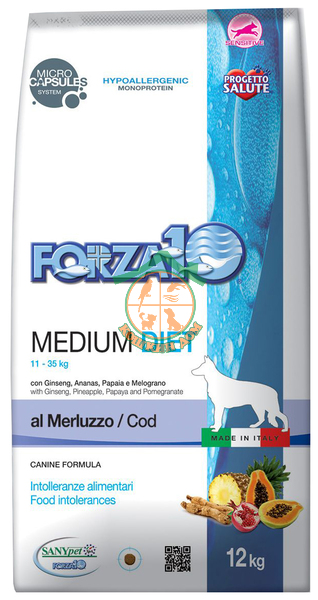 FORZA10 Medium Diet ИЗ РЫБЫ – это монопротеиновый корм для собак, разработанная компанией SANYpet для собак средних пород с пищевой непереносимостью на мясо животных интенсивного животноводства.