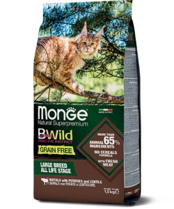 Monge BWild Cat GRAIN FREE беззерновой полноценный сбалансированный корм из мяса буйвола для крупных кошек всех возрастов.